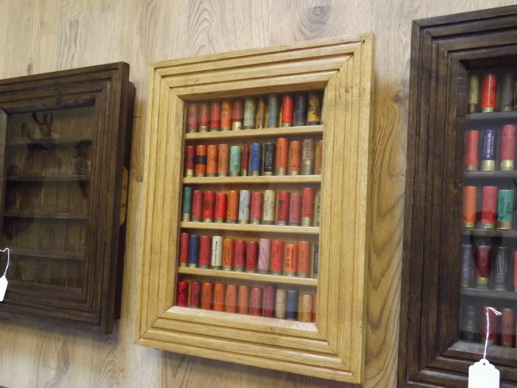 Cartridge Display CabinetSolid Oak Framed, wall mounted display cabinate to take up to 70 shotgun cartridges (shown with 50 cartridges). 55cm High x 35cm Wide x 6.5cm Deep. Available in Light or dark Oak Finish. An Ideal gift for the game or clay shooter. Supplied as cabinet only, or can be supplied with any of the following: 50 x paper cased shotgun cartridges (all different) for an additional cost of £55 inc vat (Only available via collection, we cannot send cartridges) 50 x plastic cased shotgun cartridges (all different) for an additional cost of £15 inc vat (Only available via collection, we cannot send cartridges) Please note: If collecting from our gun room we will need to see your shotgun certificate if purchasing with shotgun cartridges. Empty display cases can however be sold to or dispatched to non certificate holders. |