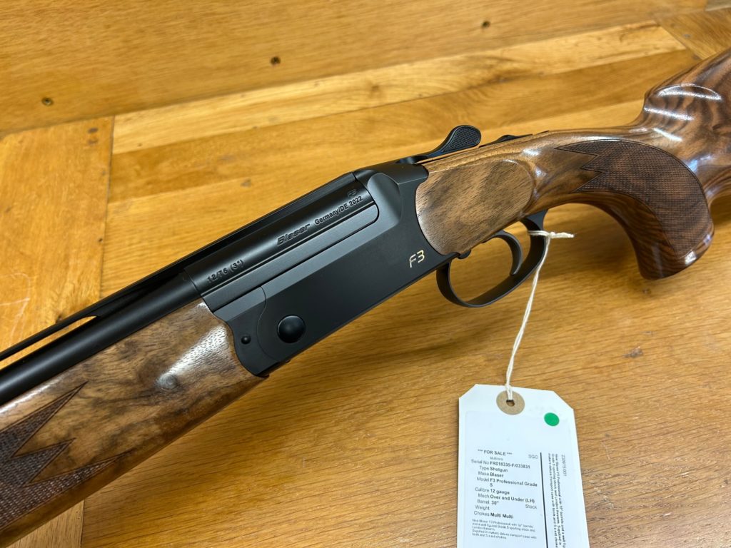 New – Left Hand Blaser F3 Professional SporterNew Left Hand Blaser F3 Professional sporter with well figured Left Hand Grade 5 wood set with 38/50 drop and 370 LOP and Left hand opening top lever. (can be supplied with RH opening top lever if desired) This gun is currently fitted with 32″ multi choke with 3″ chambers (Can be supplied with 30” barrels if required) Supplied in makers deluxe transport case with 5 x extended chokes, a set of barrel weights and stock weights for adjustment of point of balance. |